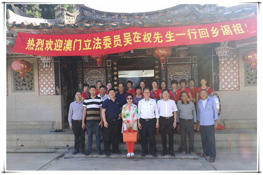 今天下午澳門吳在權(quán)宗賢攜夫人,到同安石潯村吳氏宗祠祖厝祭祖。宗親們聞訊后,敲鑼打鼓、鳴放鞭炮、熱情歡迎吳在權(quán)伉儷回鄉(xiāng)祭祖。