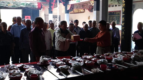 2017年10月28日上午11時整,來自金門全縣五鄉(xiāng)長宗親代表50餘人,在吳氏家廟內(nèi)舉行重陽節(jié)祭祖活動,頒發(fā)泰伯公獎學金。吳慕萱等25位宗親合計發(fā)出新臺幣48500元整,感謝信浩理事捐贈新臺幣壹萬元整作為獎學基金。