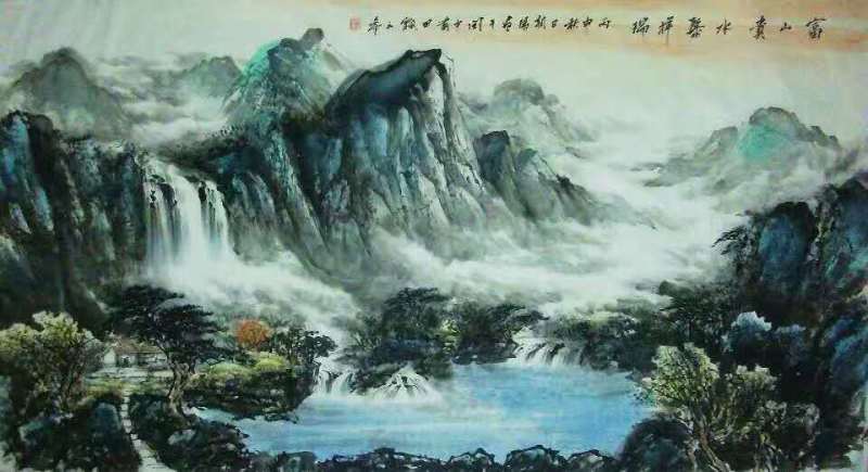 彩墨風(fēng)水畫《千山聳翠悲心起.萬壑奔流慧眼開》尺寸;大六尺!