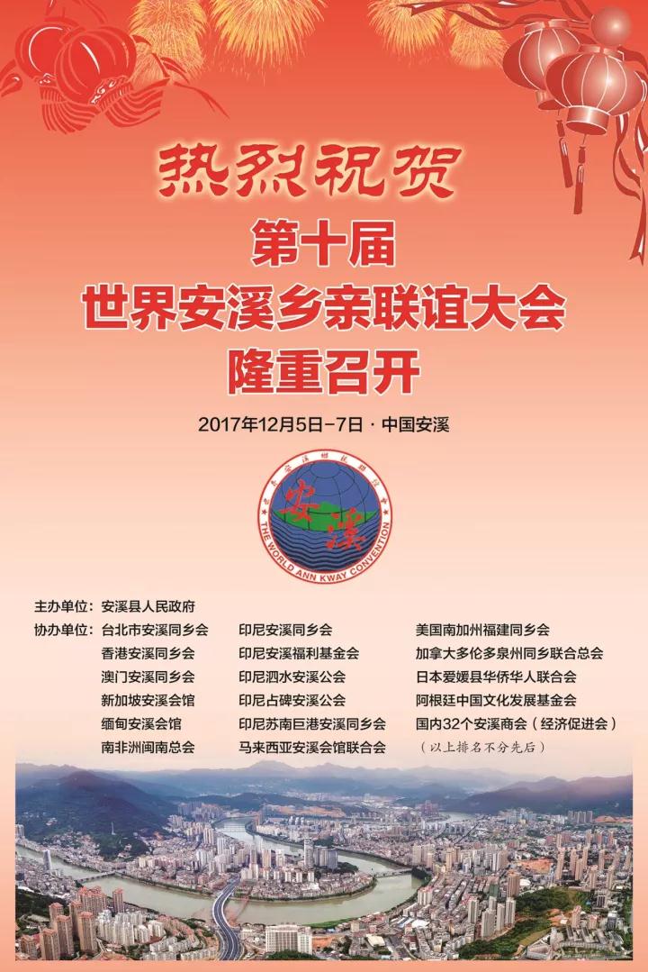 本屆大會由安溪縣人民政府主辦;香港安溪同鄉(xiāng)會、澳門安溪同鄉(xiāng)會,臺北市安溪同鄉(xiāng)會,以及新加坡安溪會館、馬來西亞安溪會館聯(lián)合會等16家社團(tuán),國內(nèi)32家異地安溪商會(經(jīng)濟(jì)促進(jìn)會)等聯(lián)合協(xié)辦。