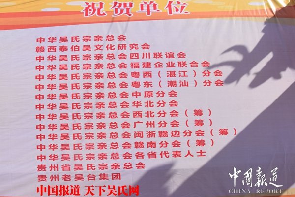 中華吳氏宗親總會主席吳文富、秘書長吳謹(jǐn)程,中國人類學(xué)民族學(xué)宗親專委會貴州吳氏宗親文化研究中心主任、貴州省吳氏宗親總會會長吳學(xué)強(qiáng),贛西泰伯文化研究會會長吳海斌、名譽(yù)會長吳成庚,原宜春地區(qū)行署專員、江西省林業(yè)廳廳長吳志清,原宜春地委宣傳部部長吳德培,宜春市人大宗教、外事委員會主任吳太平,宜春市文廣新局副局長吳俊平,宜春市袁州區(qū)農(nóng)機(jī)局局長吳建平,全國勞模吳俊良,泰伯吳氏祖地宗親聯(lián)誼總會副會長 吳樂一,中華吳氏宗親總會贛南分會會長 吳觀音生,福建企業(yè)聯(lián)合會副會長吳任濤,福建武夷山吳氏商會會長吳經(jīng)樂,萍鄉(xiāng)市吳氏宗親聯(lián)誼會會長吳文,中華吳氏宗親總會副主席吳兆萍,福建華幟吳文化促進(jìn)會執(zhí)行會長兼福建建甌市吳氏聯(lián)誼會秘書長吳超儲,廣東省英德吳氏宗親聯(lián)誼會會長吳文彬,湘贛邊界吳氏聯(lián)誼會會長吳高福,萍鄉(xiāng)蘆溪東陽聯(lián)誼會會長吳行林,新余代表吳四保,宜豐代表吳迎如,上高代表吳會德,分宜代表吳平,三陽橋書記吳生梅,中華吳氏宗親總會宜春分會、贛西泰伯文化研究會袁州分會籌備委員會會長吳心清,中華吳氏宗親總會宜春分會、贛西泰伯文化研究會袁州分會、會長吳波、名譽(yù)會長吳昌在、常務(wù)副會長吳志明、秘書長吳江、首席顧問吳俊軍、顧問吳招文,中國報(bào)道、天下吳氏網(wǎng)等媒體現(xiàn)場報(bào)道活動(dòng)盛典。