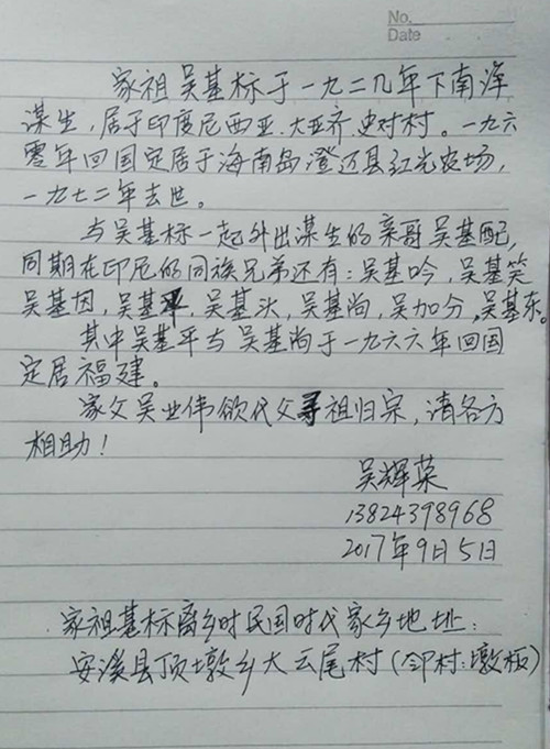 安溪縣頂墩鄉(xiāng)吳氏尋親