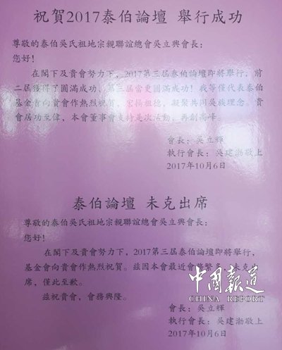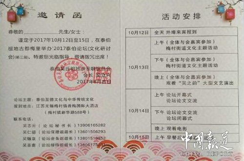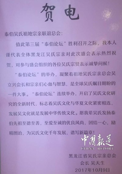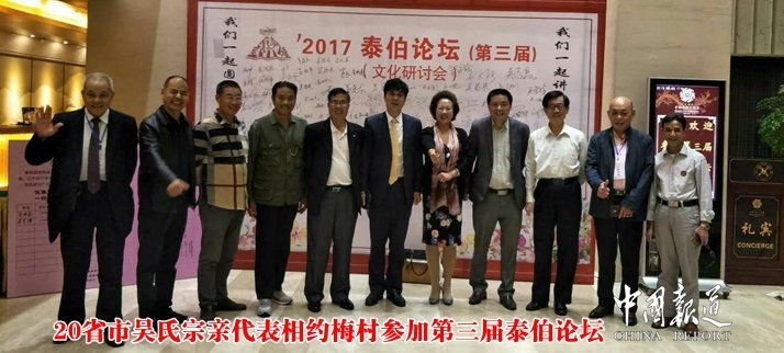 2017年10月12日—15日在這大好的日子里,華夏生肖博物館、至德世系姓氏文化園揭牌“梅村——岐山”尋根之旅線路開通儀式,以及泰伯論壇交流盛會(huì)。在吳氏祖地?zé)o錫梅村隆重舉行,來自海內(nèi)外、港澳臺(tái)、全國(guó)各地的專家學(xué)者歡聚一堂,探討至德文化。這次泰伯論壇由泰伯吳氏祖地宗親聯(lián)誼總會(huì)主辦。論壇主題:泰伯至德文化與中華傳統(tǒng)文化。至德文化是充滿活力的中華傳統(tǒng)文化。至德文化源頭深遠(yuǎn),它是一門古老的中華文化,是對(duì)三千二百多年的中華德文化的傳承和發(fā)揚(yáng)光大,與當(dāng)今社會(huì)和平發(fā)展理念一脈相承,具有強(qiáng)大的生命力,需要繼續(xù)提倡。人類文明起源于最先是道德文明。近年來,全國(guó)各地民間往來、文化交流、經(jīng)貿(mào)合作日益密切。通過論壇平臺(tái),把宗親文化、吳文化、至德文化等中華傳統(tǒng)文化在海內(nèi)外、港澳臺(tái)、全國(guó)各地宗親的心目中發(fā)揚(yáng)光大。心心相印,心心相連,通過交流論壇互勉互勵(lì),共同為中華民族偉大復(fù)興做出貢獻(xiàn)。